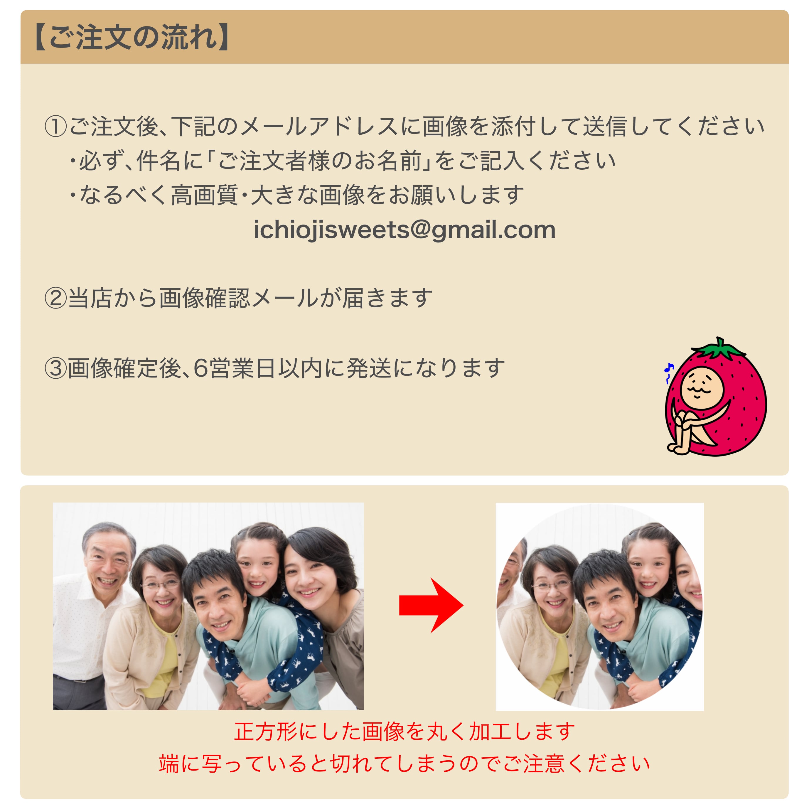 写真は基本丸く加工しますが、収まりが悪い(顔など対象物が切れてしまう)場合は四角に変更して作成させて頂きますのでご了承下さい。※はじめから四角の指定はできません。