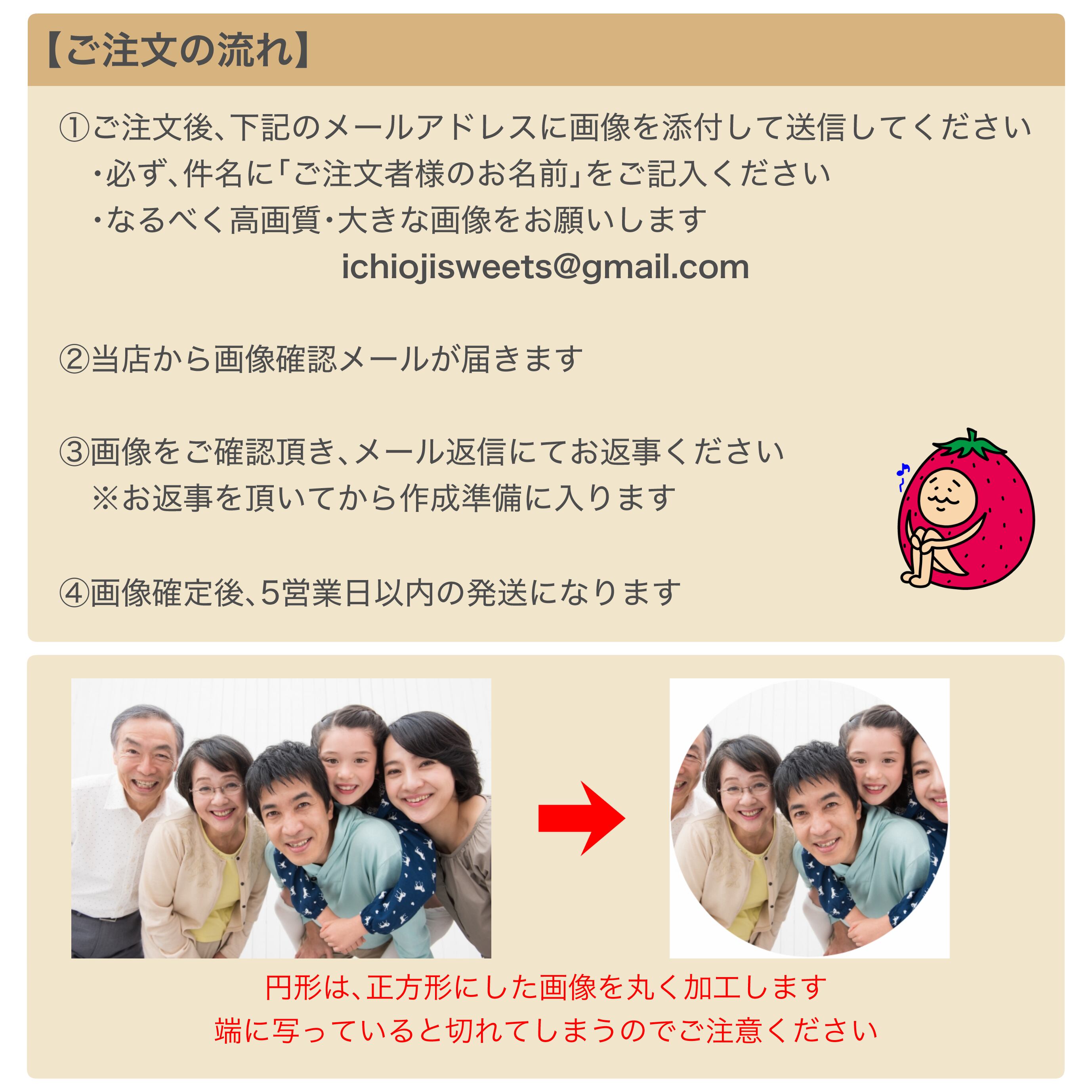 1.商品を購入お支払い後、お客様から当店のメールアドレス宛にご希望の画像を送信